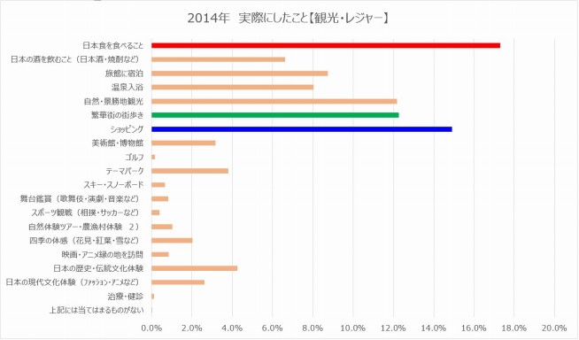 - 期待とは裏腹に実際にすることは、日本食を食べる、ショッピング、景勝地観光までが大半であり、文化体験をする外国人の割合は減る