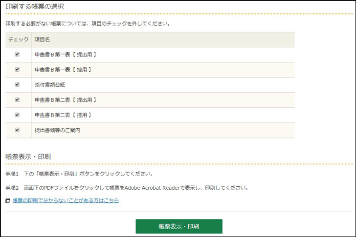 ▼「帳票表示・印刷」をクリックすることでPDFデータの取得が可能です。
